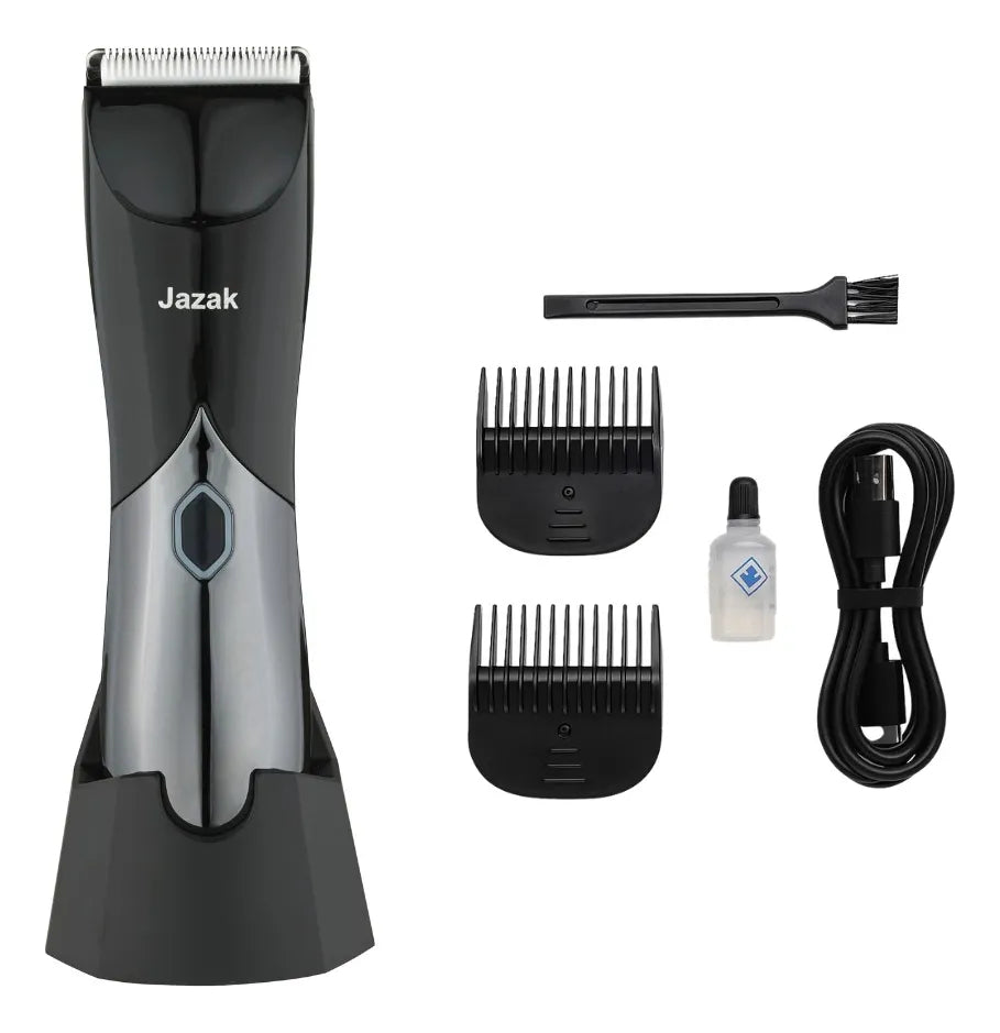 Cuchilla Móvil de Cerámica: Equipada con una cuchilla de cerámica avanzada que garantiza un corte más duradero, preciso y suave, reduciendo la irritación de la piel y manteniendo su filo por más tiempo.100% Resistente al Agua (NO SUMERGIBLE): Disfruta de la máxima flexibilidad para tu rutina de aseo. Puedes usarla en seco para un corte rápido o en la ducha para mayor comodidad y una limpieza sencilla. Su diseño completamente resistente al agua permite una limpieza fácil bajo el grifo.Luz LED Integrada: Ilumina las áreas de corte para una mayor visibilidad en todos los lugares, asegurando que no te pierdas ni un solo vello, incluso en zonas difíciles.Base de Apoyo y Recarga: Incluye una práctica base que no solo sirve para apoyar la afeitadora de forma segura, sino que también funciona como estación de recarga, manteniendo tu dispositivo listo para usar en todo momento.Diseño Ergonómico y Compacto: Con unas medidas de 15cm de alto x 4cm de ancho, su forma ergonómica se adapta cómodamente a tu mano, facilitando el control y la maniobrabilidad.Accesorios Incluidos para un Cuidado Completo:La afeitadora Jazak viene con los accesorios esenciales para una experiencia de afeitado y recorte óptima:Peines Guía (2 unidades): Permiten ajustar la longitud del corte, ofreciéndote versatilidad para diferentes estilos de barba o vello corporal.Cepillo de Limpieza: Indispensable para mantener la cuchilla y el cabezal libres de vello, asegurando un rendimiento óptimo y prolongando la vida útil del aparato.Aceite Lubricante: Pequeña botella de aceite para lubricar las cuchillas, un paso crucial para mantener su eficiencia y durabilidad.Cable de Carga USB: Para una recarga cómoda y universal, compatible con diversos adaptadores de corriente USB (no incluido).Ideal para:Afeitado y recorte de vello corporal (pecho, espalda, piernas, etc.).Mantenimiento y estilizado de barba.Uso en seco o bajo la ducha.Personas que buscan durabilidad y precisión en su herramienta de aseo.En la caja:1 x Afeitadora Corporal y Barba Jazak2 x Peines Guía1 x Cepillo de Limpieza1 x Aceite Lubricante1 x Cable de Carga USB1 x Base de Apoyo y Recarga