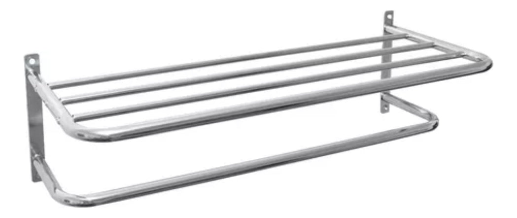 Repisa Estante Toallero Cromado con diseño de barral para un estilo moderno y minimalista.Fabricado en metal resistente con acabado niquelado para mayor durabilidad y resistencia al desgaste.Capacidad para una toalla, ideal para optimizar el espacio en tu baño.* Todo de Acero cromado* Con repisa para colocar toallas* Super resistente* Medidas: 58 cm (largo), 15.5 cm (alto), 23 cm (profundidad)* Medidas del toallero inferior: 14 cm* Separación entre tornillos Ancho 55 cm alto 14.5 cm* Incluye tarugos y tornillos para su instalación